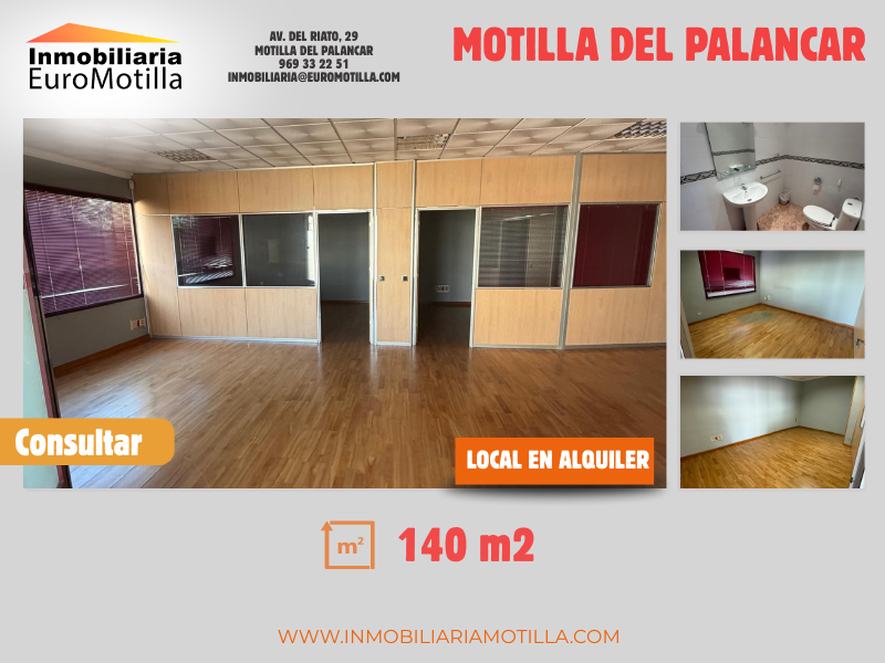 Se alquila local comercial de 140 metros cuadrados en Motilla del Palancar, ideal para oficinas, clínica, academia o cualquier actividad profesional.